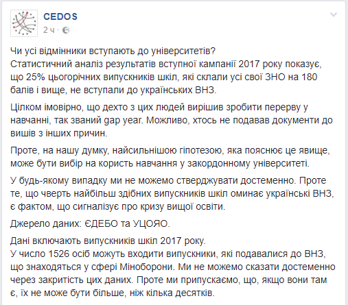"В любом случае, мы не можем утверждать точно. Однако то, что четверть наиболее способных выпускников школ проходит мимо украинских ВУЗов является фактом, который сигнализирует о кризисе высшего образования", – указывают в CEDOS.