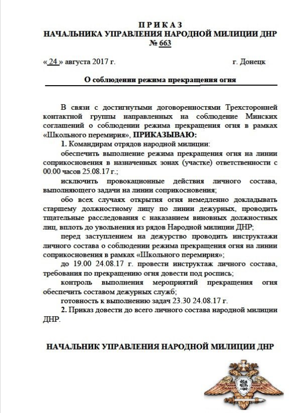 Помимо этого, был опубликован "приказ" о соблюдении режима прекращения огня с 25 августа текущего года в рамках "школьного перемирия".