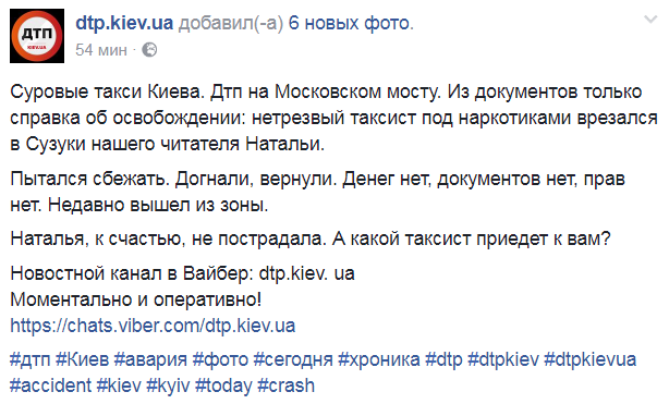 "Суровые такси Киева. ДТП на Московском мосту. Из документов только справка об освобождении: нетрезвый таксист под наркотиками врезался в Suzuki", - говорится в сообщении.