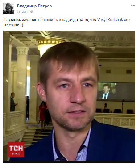 "Гаврилюк изменил внешность в надежде на то, что Vasyl Krutchak его не узнает:)", - подписал Петров фото, на котором Гаврилюк предстал в новом образе.