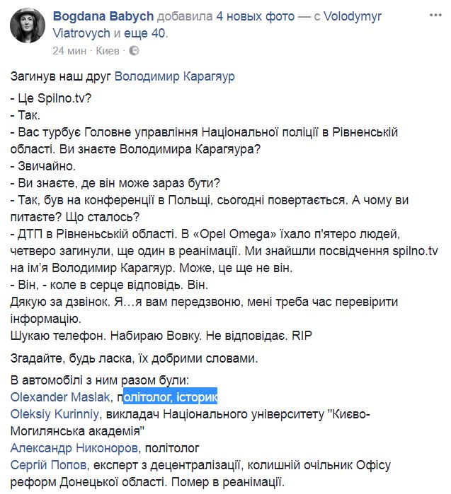 О жутком ДТП в соцсетях пишут коллеги погибших. Так, директор Института практической политики Богдана Бабич сообщила, что коллеги погибших выехали на место аварии.