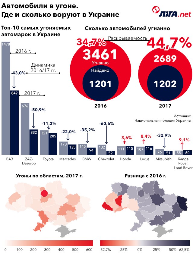 Кстати, в первом полугодии этого года количество автоугонов в Украине сократилось на 25%. Всего за полгода было угнано 2689 автомобилей в сравнении с показателями прошлого года -  3461. При этом раскрываемость преступлений, связанных с кражей автомобилей, возросла.