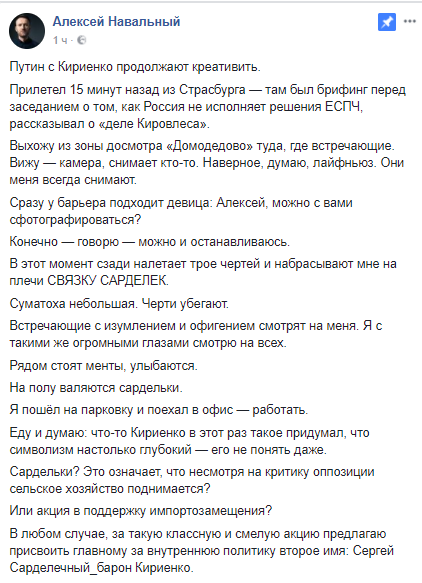 Навальный пишет, что инцидент произошел сразу по прилету из Страсбурга. Он остановился по просьбе девушки, пожелавшей сфотографироваться с ним. "В этот момент сзади налетает трое чертей и набрасывают мне на плечи СВЯЗКУ САРДЕЛЕК. Суматоха небольшая. Черти убегают", — написал оппозиционер (орфография автора сохранена).