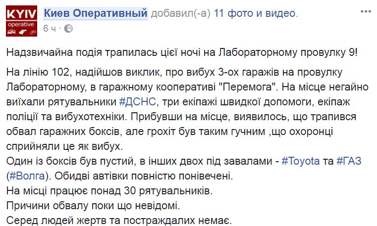 "Чрезвычайное происшествие произошло ночью на Лабораторном переулке 9! На линию 102, поступил вызов, о взрыве 3-х гаражей в переулке Лабораторный, . На место немедленно выехали спасатели ГосЧС, три экипажа скорой помощи, экипаж полиции и взрывотехники. Прибыв на место, оказалось, что случился обвал гаражных боксов, но грохот был таким громким, что охранники восприняли это как взрыв", - говорится в сообщении.