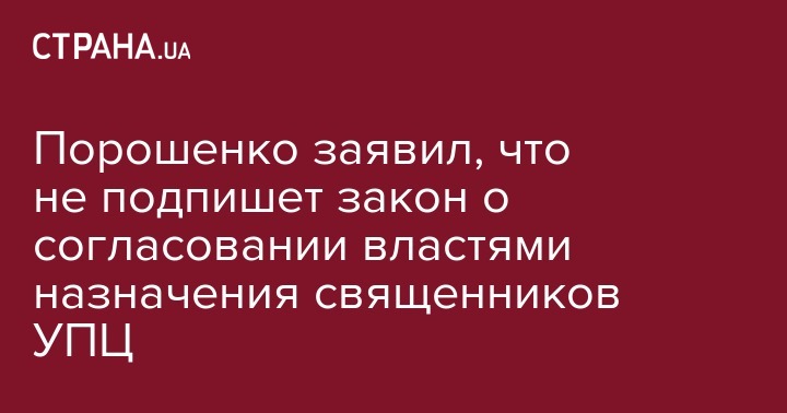 Президент Петр Порошенко заявил, что не подпишет законопроект о назначении руководства УПЦ МП по согласованию с государством. Об этом он сказал в ходе своего обращения к парламенту, передает корреспондент "Страны".