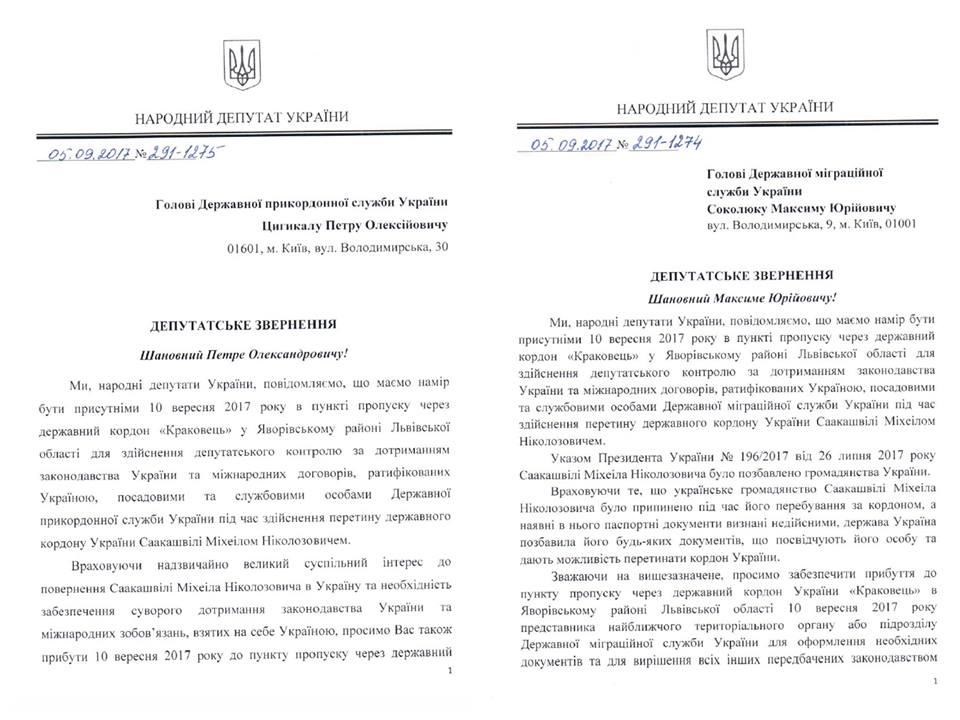 27 народный депутатов попросили глав ГФС и ГПС присутствовать в пункту пропуска "Краковец" во время возвращения Михаила Саакашвили. Об этом пишет пресс-слжуба партии "Рух новых сил" на странице в Facebook.