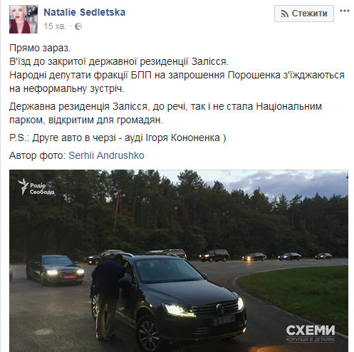 "Прямо сейчас. Въезд на закрытую государственную резиденции Залесье. Народные депутаты фракции БПП по приглашению Порошенко съезжаются на неформальную встречу. Государственная резиденция Залесье, кстати, так и не стала Национальным парком, открытым для граждан.