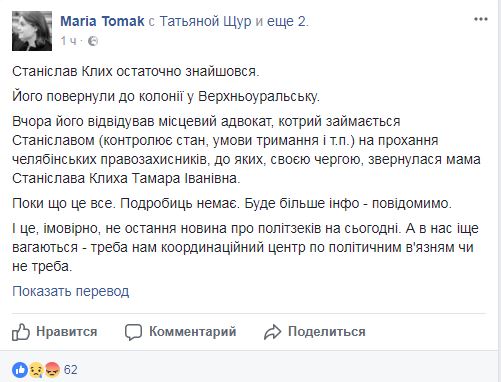 "Станислав Клых окончательно нашелся. Его вернули в колонию в Верхнеуральске", - пишет она.