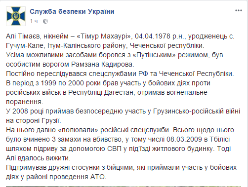 На погибшего во время взрыва в центре Киева Али Тимаева (Тимура Махаури) давно охотились спецслужбы Российской Федерации. Об этом говорится в сообщении Службы безопасности Украины в Facebook.