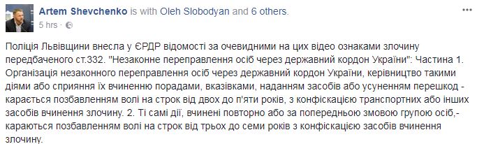 "Полиция Львовщины внесла в ЕРДР сведения по очевидным на этом видео признакам преступления предусмотренным ст.332. "Незаконная переправка лиц через государственную границу Украины": организация незаконной переправки лиц через государственную границу Украины, руководство такими действиями или содействие их совершению советами, указаниями, предоставлением средств или устранением препятствий - наказывается лишением свободы на срок от двух до пяти лет с конфискацией транспортных или других средств совершения преступления. 2. Те же действия, совершенные повторно или по предварительному сговору группой лиц,- наказываются лишением свободы на срок от трех до семи лет с конфискацией средств совершения преступления", - сообщил он.