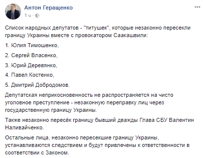 Пять нардепов и экс-глава СБУ Валентин Наливайченко незаконно пересекли госграницу Украины вместе с лидером партии "Рух новых сил", экс-главой Одесской облгосадминистрации Михаилом Саакашвили. Об этом написал  советник главы МВД Антон Геращенко на своей странице в Facebook.