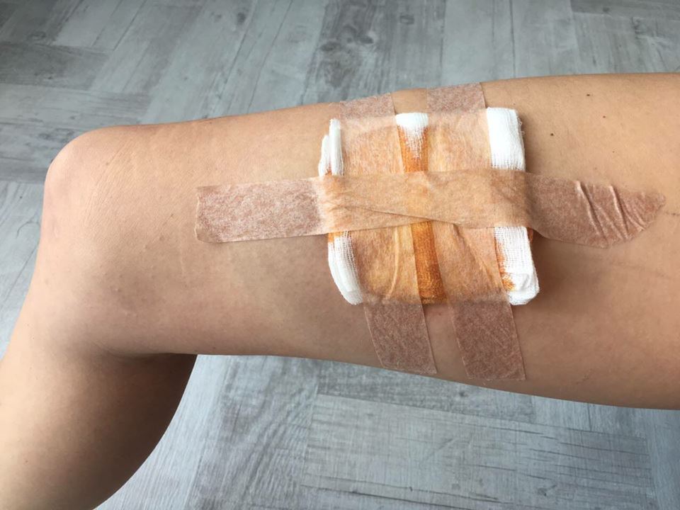 "Я сразу не почувствовала, забежала за колонну, осмотрела быстро ребенка, который был на руках, все в порядке, увидела дырку на шортах у себя, потом рану, начала звонить мужу, но тут же увидела, что он идёт", - говорит женщина.