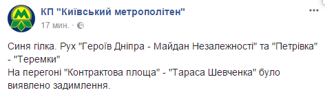 В Киеве на "синей" (Куреневско-Красноармейской) ветке метрополитена произошло ЧП. Как сообщили  источники "Страны", задержка движения поездов в сторону станции "Героев Днепра" произошла из-за задымления на отрезке от станции метро "Контрактовая площадь" до станции "Тараса Шевченко".
