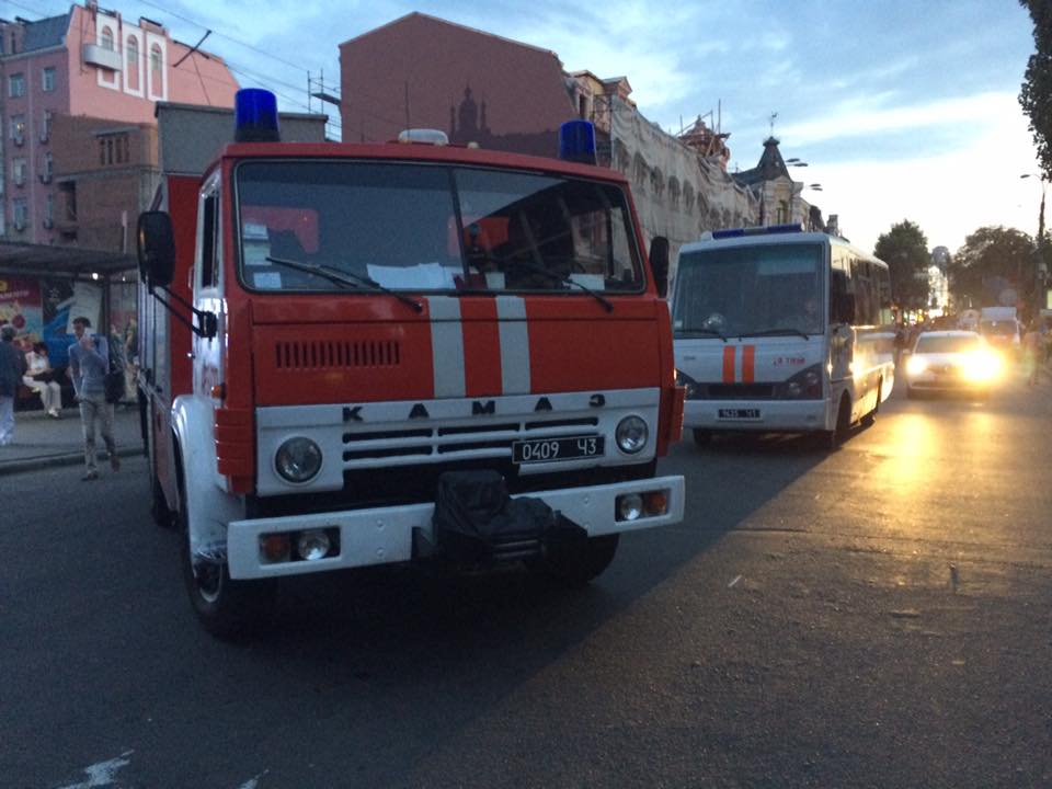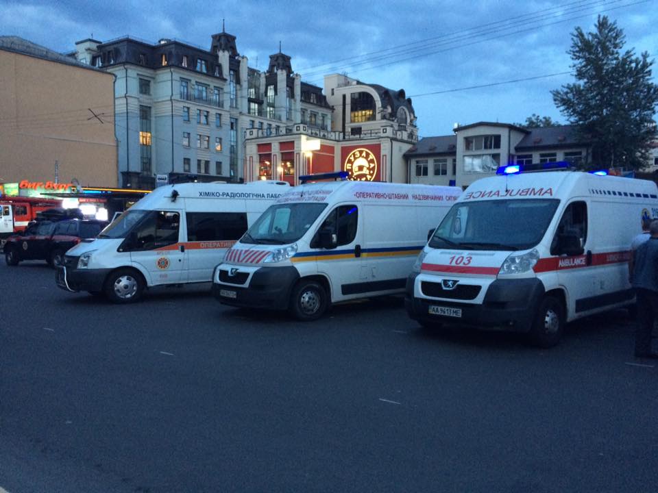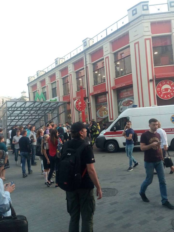 Появились фото, как пассажиры покидают станцию метро Контрактовая площадь, к выходу к станции приехали пожарные машины и несколько машин скорой помощи.