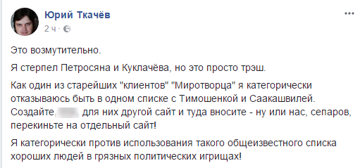 "Это возмутительно. Я стерпел Петросяна и Куклачёва, но это просто трэш. Как один из старейших "клиентов" "Миротворца" я категорически отказываюсь быть в одном списке с Тимошенкой и Саакашвилей. Создайте, ... , для них другой сайт и туда вносите - ну или нас, сепаров, перекиньте на отдельный сайт! Я категорически против использования такого общеизвестного списка хороших людей в грязных политических игрищах!" - заявил он.