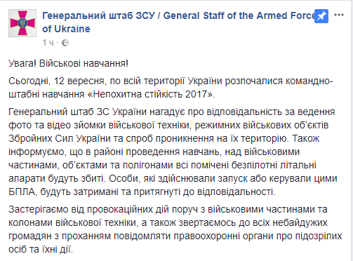 По всей территории Украины сегодня, 12 сентября, начались командно-штабные учения "Несокрушимая устойчивость-2017". Об этом сообщает Генеральный штаб ВС Украины в Facebook.