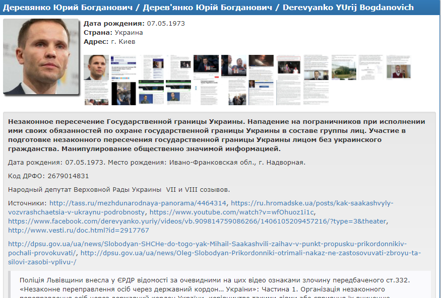 Народного депутата Верховной Рады Юрия Деревянко внесли в списки данных "Миротворца" за незаконное пересечение украинской границы. Об этом сообщается в разделе "Чистилище" на сайте.