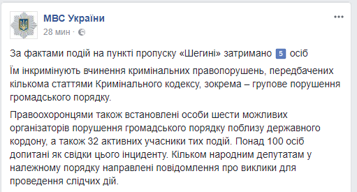 В Украине начались первые задержания после воскресного массового незаконного прорыва государственной границы в пункте пропуска "Шегини" во главе с Михаилом Саакашвили. Пресс-служба МВД в Facebook сообщила, что по делу уже задержаны 5 человек.