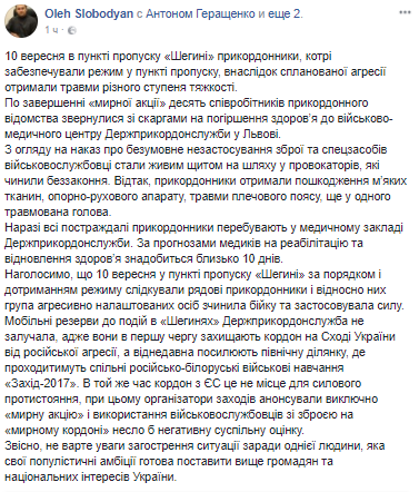 "По завершении" мирной акции "десять сотрудников пограничного ведомства обратились с жалобами на ухудшение здоровья в военно-медицинский центр Госпогранслужбы во Львове", - написал Слободян.