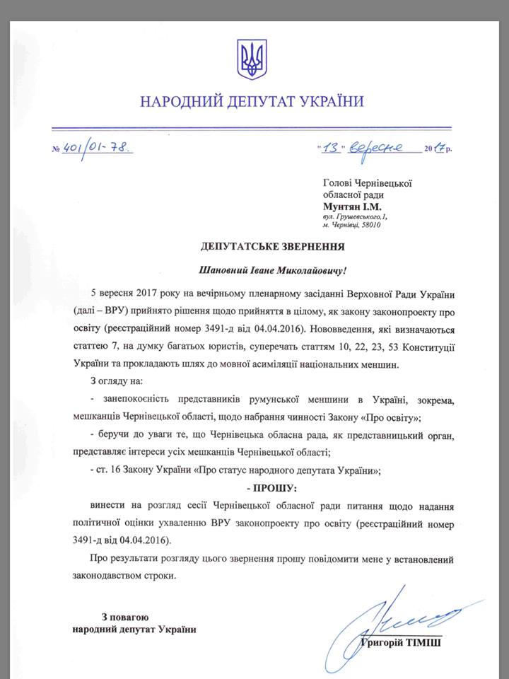 Тимиш в своем обращении отмечает, что Черновицкая областная рада представляет интересы всех жителей региона, в том числе и многочисленной румынской общины. По словам нардепа принятие антиконституционного закона вызвало серьезную озабоченность в среде румын Черновицкой области.