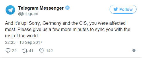 Telegram  оперативно устранил проблемы с доступом к сервису, с которыми ранее столкнулись некоторые европейские пользователи. Об этом сообщается в официальном аккаунте мессенджера в Twitter.