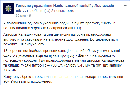 Дома у одного из сторонников Михаила Саакашвили, который помогал ему прорывать границу в "Шегенях" полиция нашла оружие и боеприпасы. Об этом сообщает львовская полиция в Facebook.