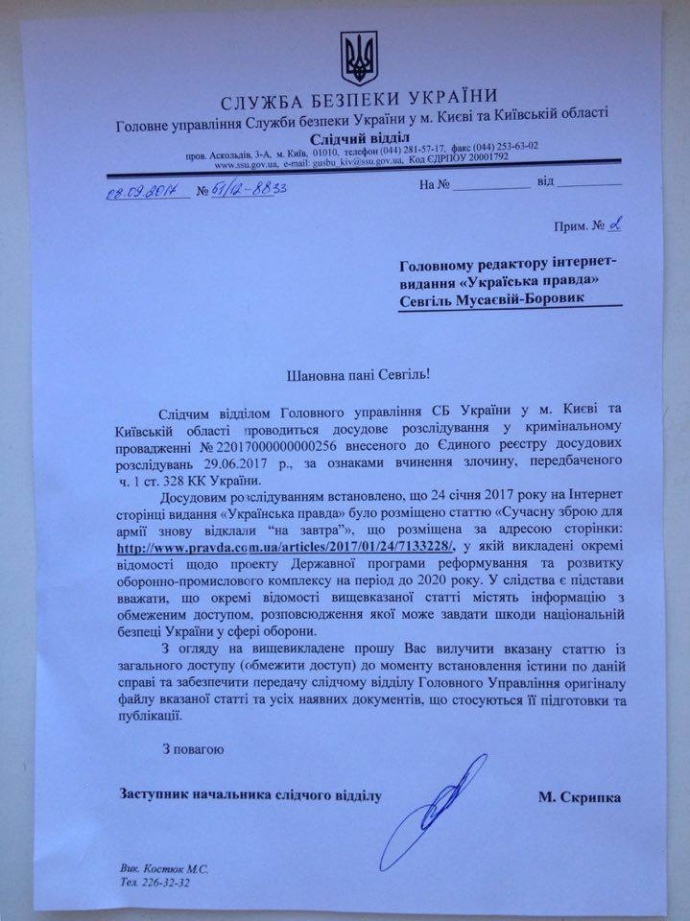 "Учитывая вышеизложенное, прошу Вас удалить указанную страницу из общего доступа (ограничить доступ) до момента установления истины по данному делу и обеспечить передачу следственному отделу Главного Управления оригинала файла указанной статьи и всех имеющихся документов, касающихся ее подготовки и публикации", – говорится в письме СБУ.