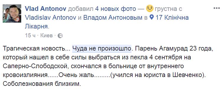 "Чуда не произошло. Парень Агамурад, 23 года, который нашел в себе силы выбраться из пекла 4 сентября на Саперно-Слободской, скончался в больнице от внутреннего кровоизлияния", - говорится в его сообщении.