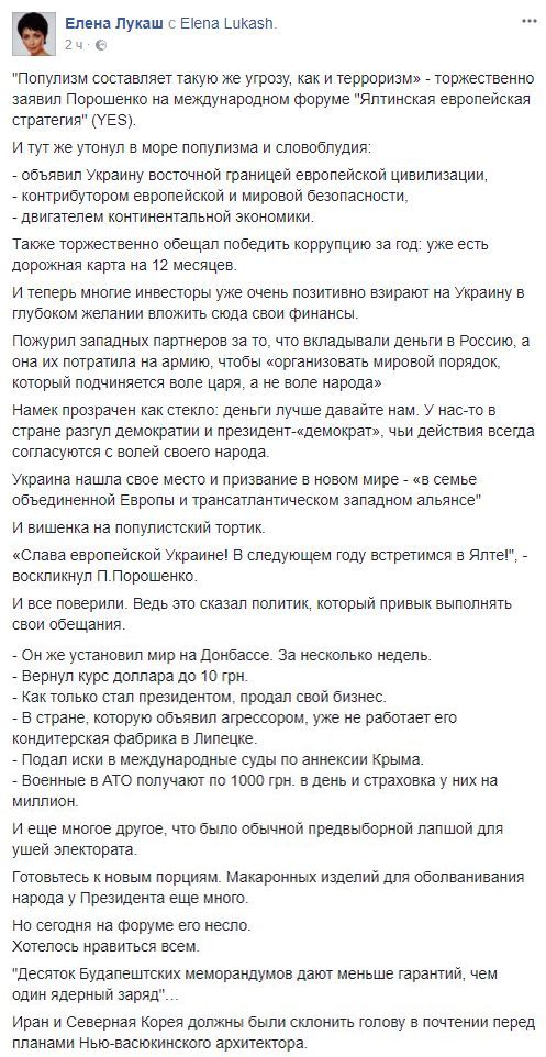 Адвокат Елена Лукаш: "Популизм составляет такую же угрозу, как и терроризм" - торжественно заявил Порошенко на международном форуме "Ялтинская европейская стратегия" (YES). И тут же утонул в море популизма и словоблудия: