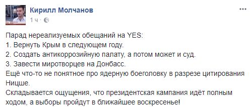 Политолог Кирилл Молчанов: "Парад нереализуемых обещаний на YES: