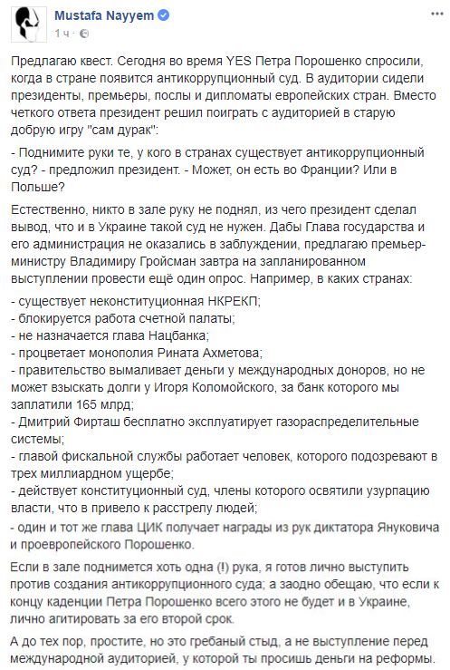Народный депутат Мустафа Найем: "Предлагаю квест. Сегодня во время YES Петра Порошенко спросили, когда в стране появится антикоррупционный суд. В аудитории сидели президенты, премьеры, послы и дипломаты европейских стран. Вместо четкого ответа президент решил поиграть с аудиторией в старую добрую игру "сам дурак":