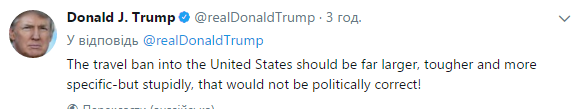 "Запрет на въезд в США (иностранных граждан - прим ред.) должен быть гораздо шире, жестче и более конкретным", - написал он в twitter. "Но какая глупость - это было бы не политкорректно", - добавил американский президент.