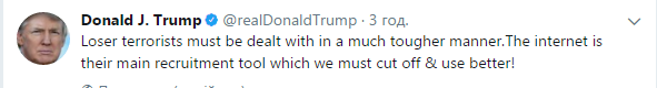 "С неудачниками-террористами надо обращаться куда более жестко. Интернет - это их главный инструмент вербовки, который мы должны отрезать и использовать лучшим способом", - написал Трамп.