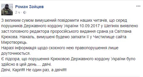 "С прискорбием вынужден сообщить нашим читателям, что среди нарушителей Государственной границы Украины 10.09.2017 в Шегини обнаружена ..... Светлана Крюкова. К сожалению, вынуждены будем запихнуть ее в Чистилище сайта Миротворец", - написал Зайцев у себя в Facebook.