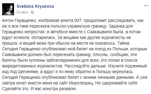Позже советник главы МВД Антон Геращенко в нарушение законодательства опубликовал в Facebook личные данные Крюковой - билет на поезд Интерсити, по которому заместитель главного редактора "Страны" должна была из Перемышля уехать в Киев - в компании Михо и его соратников.