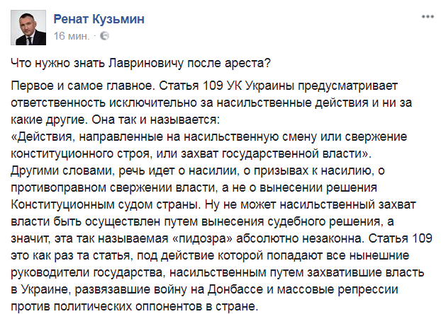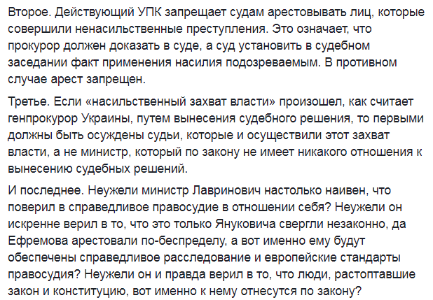 В первую очередь бывший замгенпрокурора указал на фабулу инкриминируемой Лавриновичу статьи Уголовного кодекса и отметил, что согласно действующему УПК Украины, его могли заключить под арест только доказав совершение министром юстиции Украины, при попытке "захвата власти", какого-либо насилия.