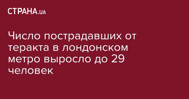 В результате теракта в метро Лондона число пострадавших увеличилось до 29 человек, передает телеканал Sky News.