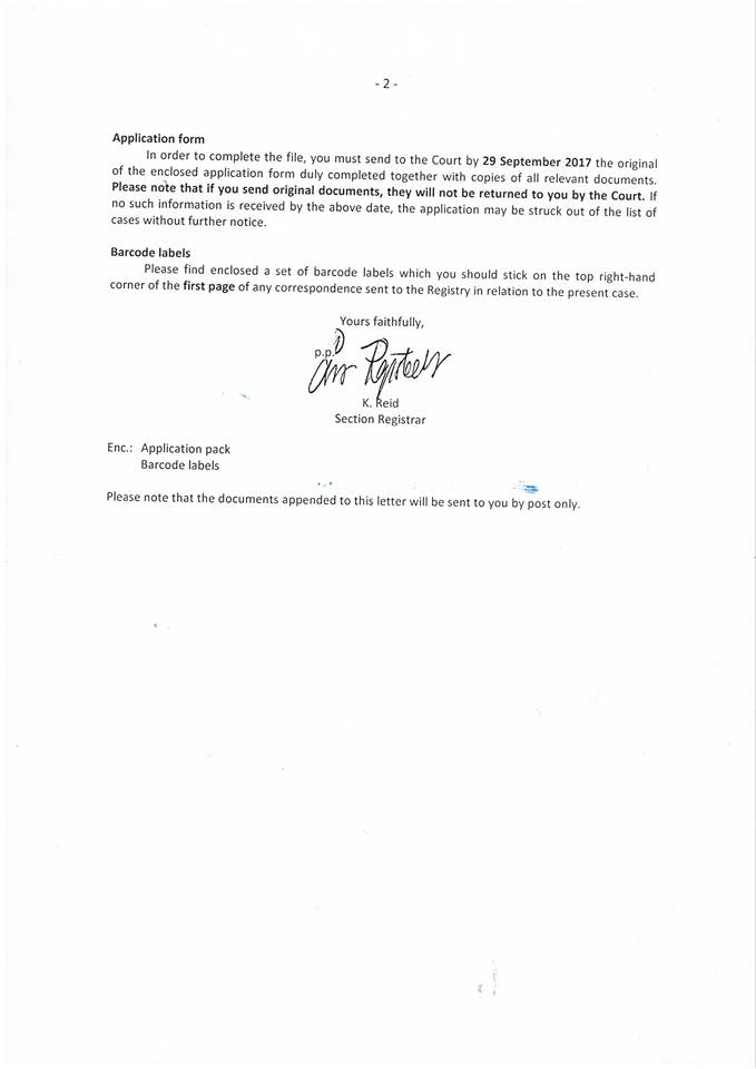 Он также опубликовал фото документа, полученного им из ЕСПЧ.