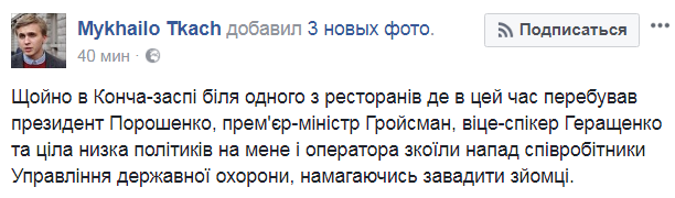"Только что в Конча-Заспе возле одного из ресторанов, где в это время находился президент Порошенко, премьер-министр Гройсман, вице-спикер Геращенко и целый ряд политиков, на меня и оператора совершили нападение сотрудники Управления государственной охраны, пытаясь помешать съемке" , - написал он.