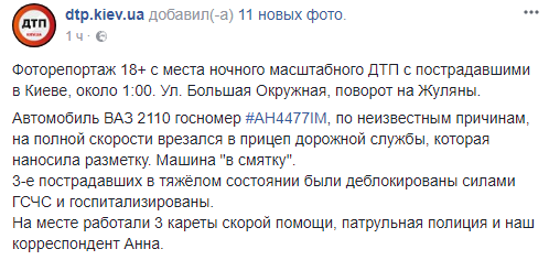 ДТП произошло около часа ночи на ул. Большая Окружная. ВАЗ 2110, по неизвестным причинам, на полной скорости врезался в прицеп дорожной службы, которая наносила разметку. Трое пострадавших были госпитализированы в тяжелом состоянии.
