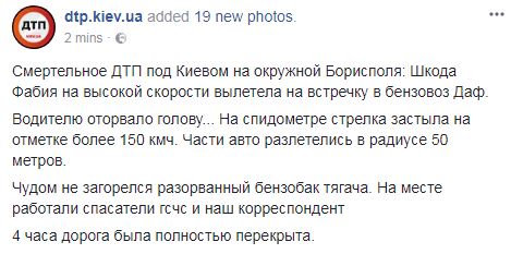"Водителю оторвало голову... На спидометре стрелка застыла на отметке более 150 кмч. Части авто разлетелись в радиусе 50 метров", - написано в сообщении.
