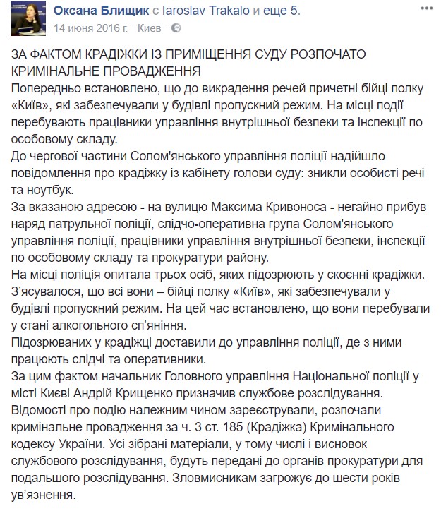 Изначально в деле по ограблению главы Соломенского райсуда проходило трое полицейских. Источник фото: facebook.com/Оксана Блищик