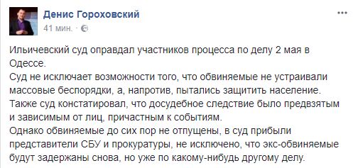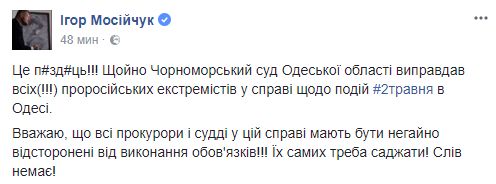 Игорь Мосийчук, народный депутат: "Это п...ц!!! Только что Черноморский суд Одесской области оправдал всех (!!!) пророссийских экстремистов по делу о событиях 2 мая в Одессе. Считаю, что все прокуроры и судьи в этом деле должны быть немедленно отстранены от исполнения обязанностей!!! Их самих надо сажать! Слов нет!"