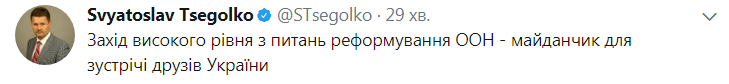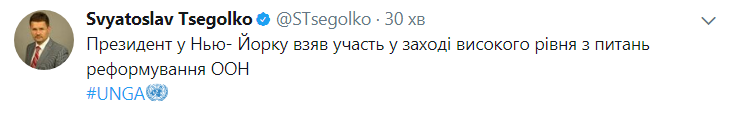 "Президент в Нью-Йорке принял участие в мероприятии высокого уровня по вопросам реформирования ООН", - сообщил Цеголко.