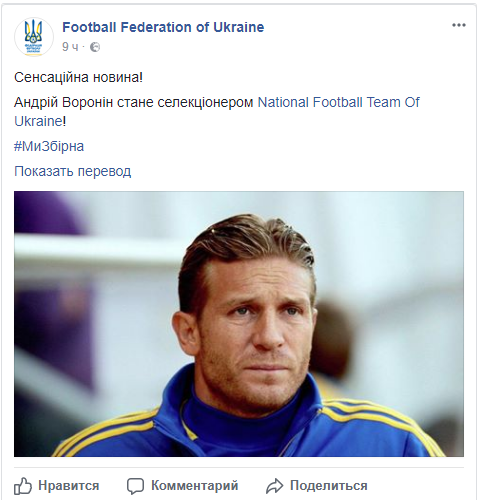 "Андрей Воронин станет селекционером National Football Team Of Ukraine!", - говорится в сообщении.