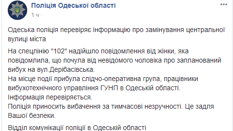 В Одессе полиция проверяет информацию о заминировании улицы Дерибасовской. Об этом в Facebook сообщает полиция области.