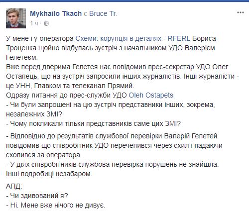 По словам Гелетея, которые приводит журналист, сотрудник УГО "перечепився через схил" и, падая, схватился за оператора".