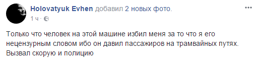 "Только что человек на этой машине избил меня за то что я его нецензурным словом ибо он давил пассажиров на трамвайных путях. Вызвал скорую и полицию", - написал он. Журналист опубликовал фото номеров и лица нападавшего.