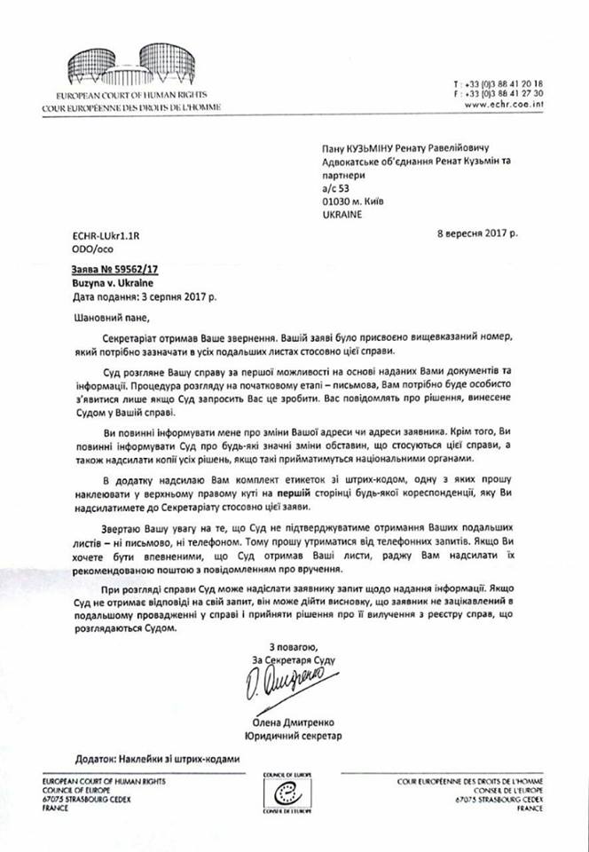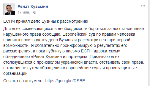 "Я обязательно проинформирую о результатах его рассмотрения, а пока публикую письмо ЕСПЧ адвокатскому объединению "Ренат Кузьмин и партнеры". Призываю всех, столкнувшихся с произволом украинской власти, отстаивать свои права, в том числе путем обращения в европейские суды и правозащитные организации", - пишет Кузьмин, публикуя ответ из суда.