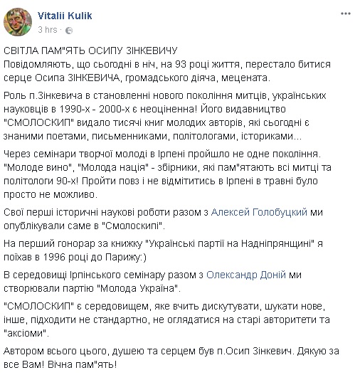"Светлая память! Сообщают, что сегодня в ночь, перестало биться сердце Осипа Зинкевича, общественного деятеля, мецената. Роль Зинкевича в становлении нового поколения художников, украинских ученых в 1990-х - 2000-х является неоценима! Его издательство "Смолоскип" выдало тысячи книг молодых авторов... "Молодое вино", "Молодая нация" - сборники, которые помнят все художники и политологи 90-х!" - написал автор публикации.